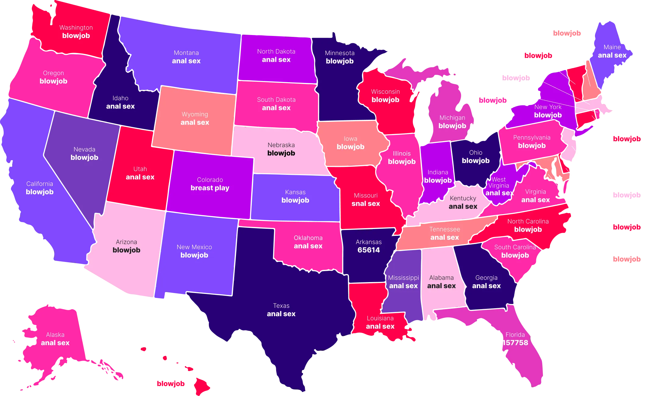 State-by-state trends split along familiar lines. Coastal and traditionally blue states skew toward oral-focused searches, while much of the South and Midwest leans heavily into anal-related kinks. Colorado chose chaos in the best way. While the rest of the country picked sides between blowjobs and anal, Colorado went its own route and crowned breast play the winner.